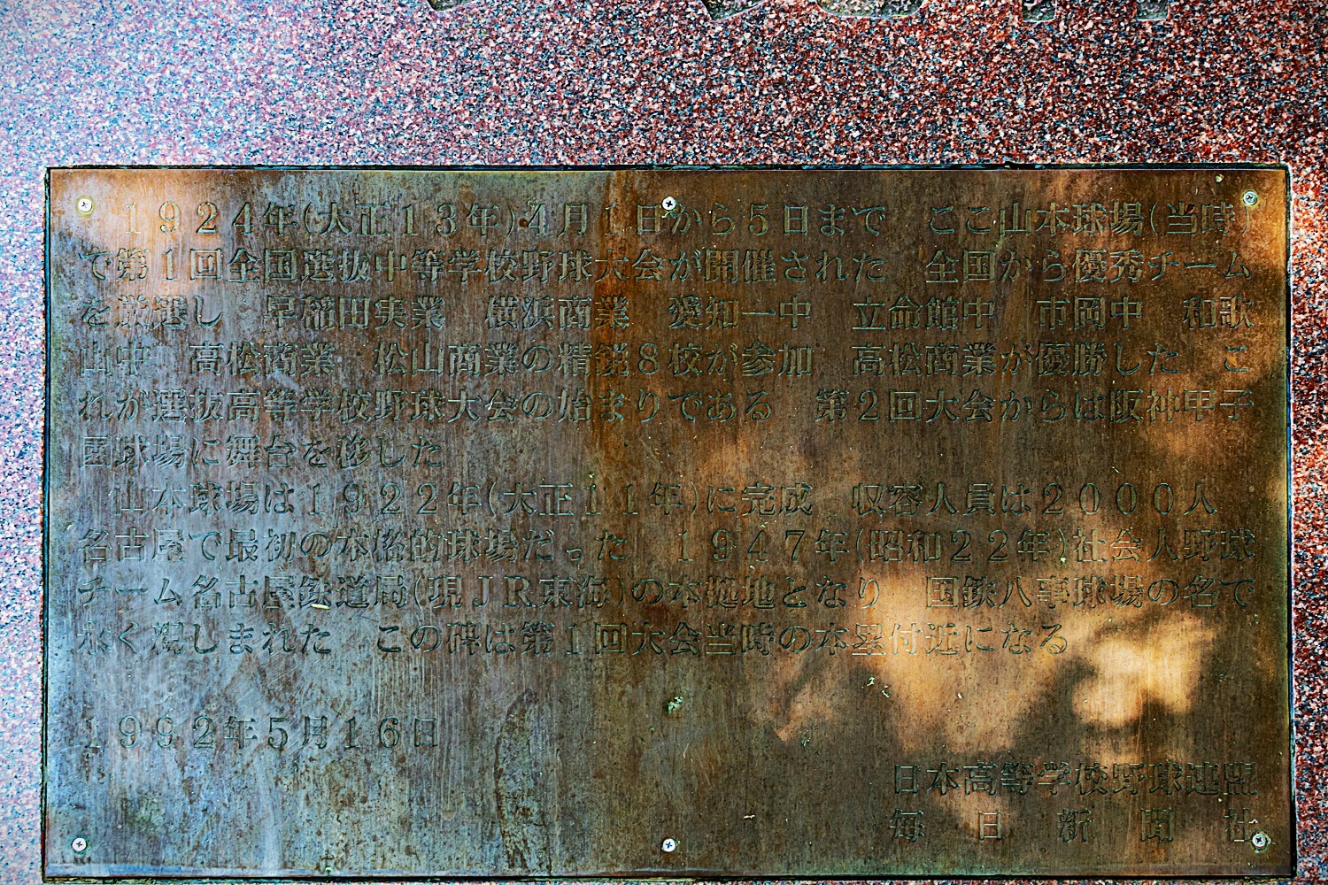 山本球場は1922年(大正11年)に完成、収容人員は2000人名古屋で最初の本格的球場だった。1947年(昭和22年)社会人野球チーム名古屋鉄道局(現JR東海)の本拠地となり、国鉄八事球場の名で永く親しまれた。この碑は第1回大会当時の本塁付近になる。